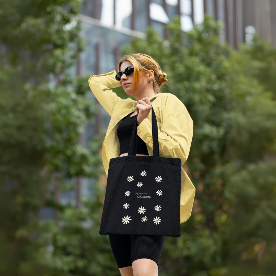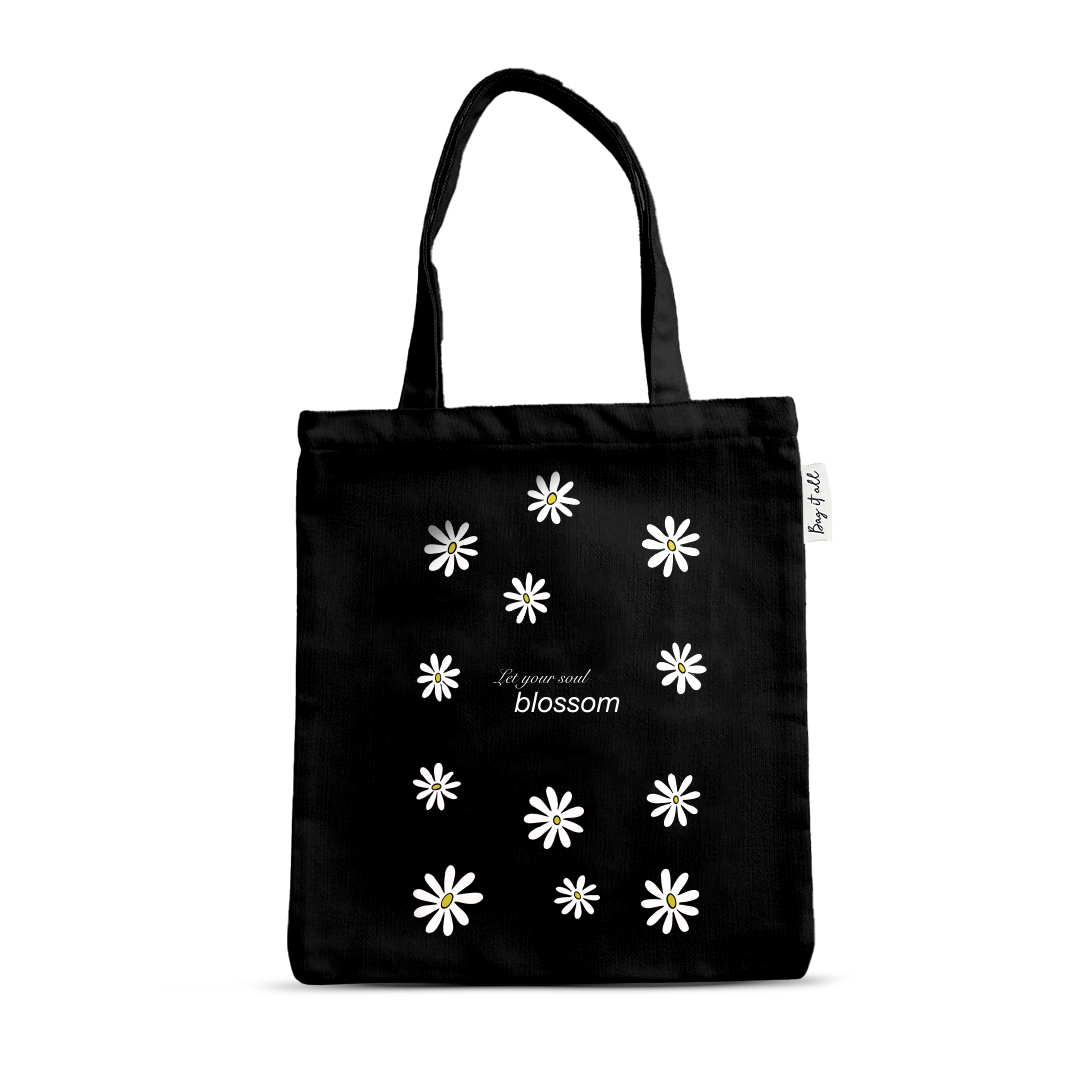 The Blossom in the Dark Tote is a soft, floral reminder that growth doesn’t need noise — just courage. Printed with hand-drawn white daisies and the inspiring line “Let your soul blossom”, this tote adds a poetic touch to your everyday essentials. Set against a black cotton canvas, the delicate white print pops with contrast and calm energy. It’s for the girls who believe in slow magic, quiet power, and blooming on their own timeline.