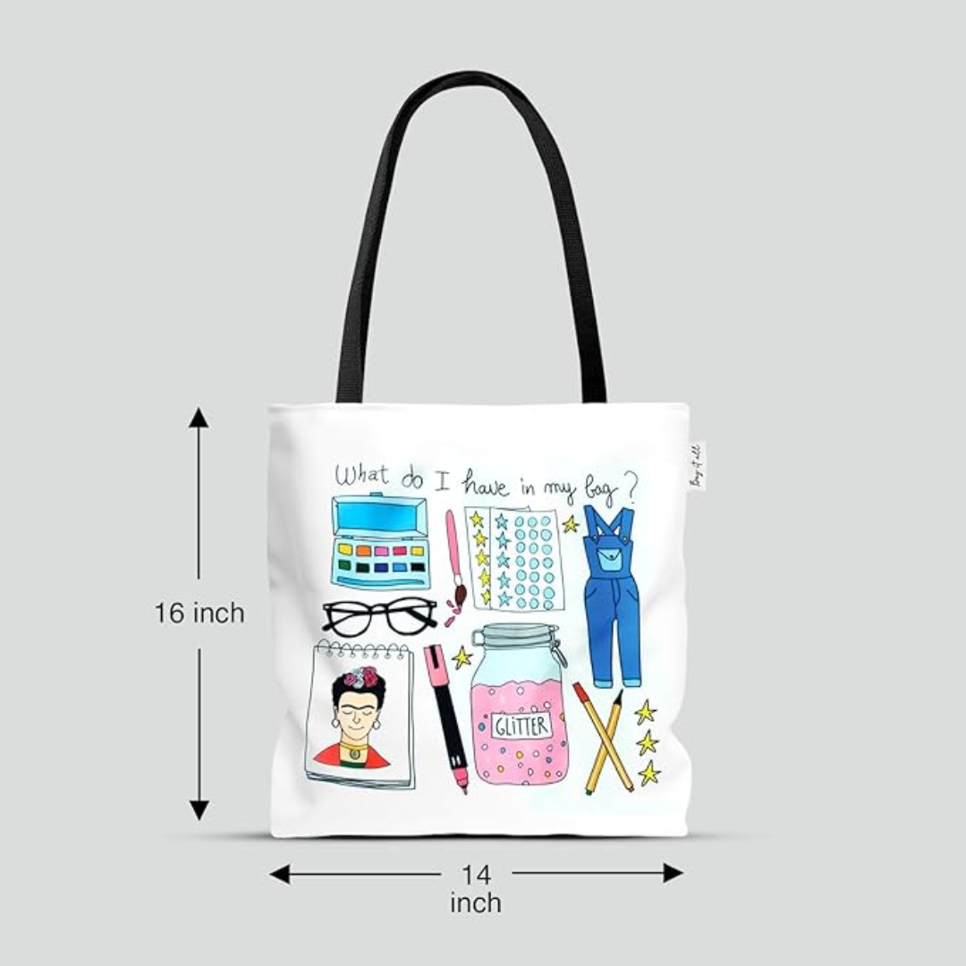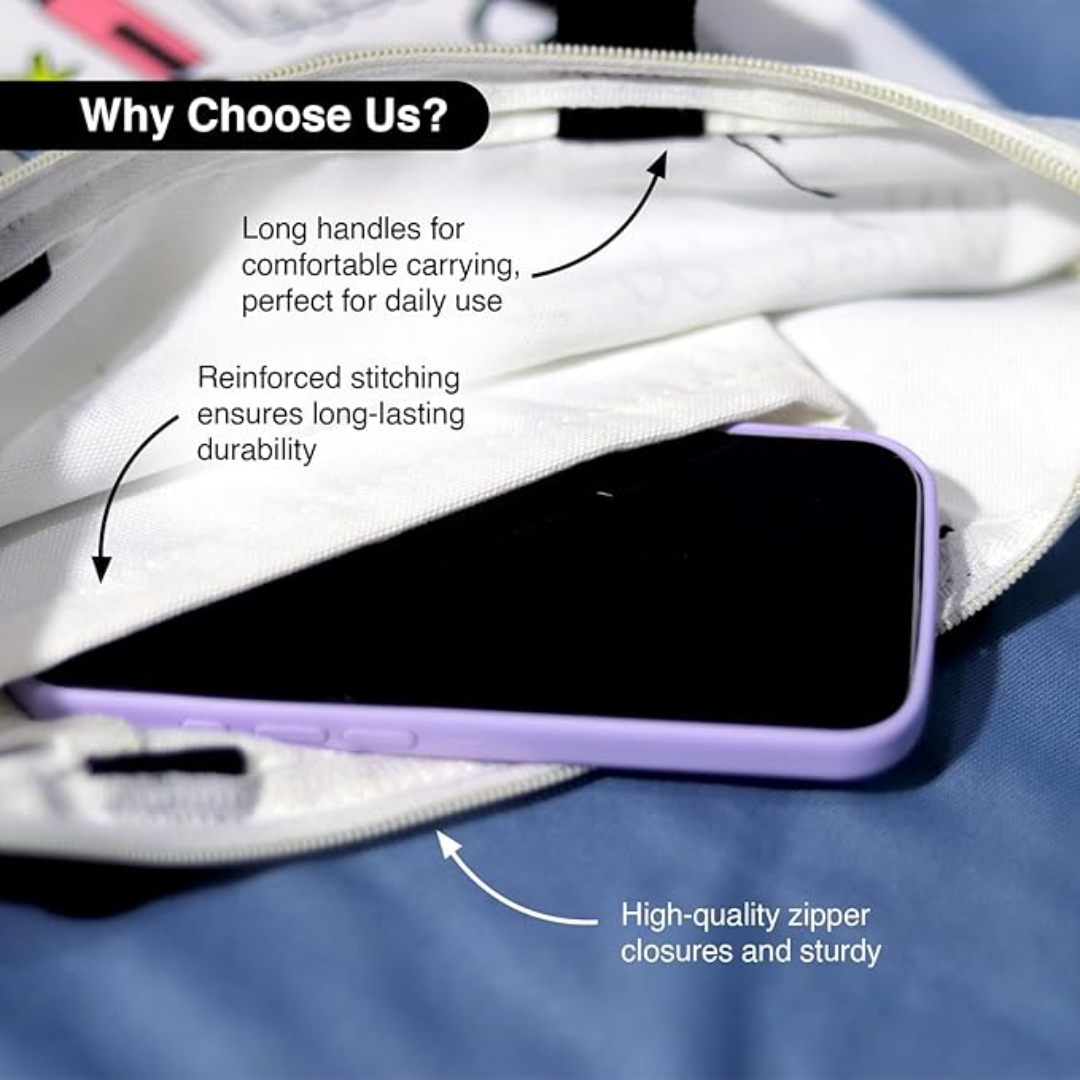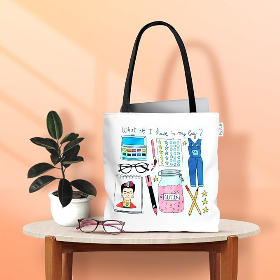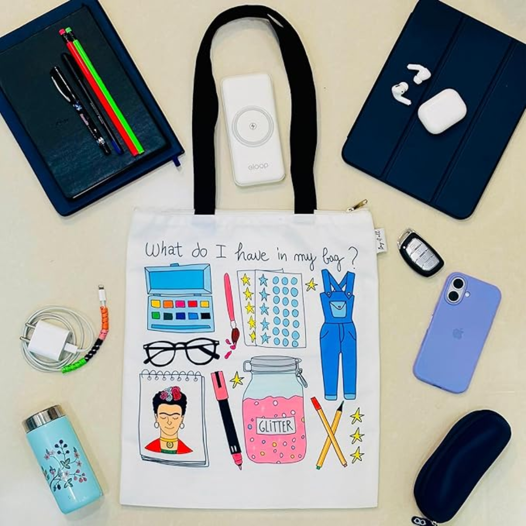 A quirky black cotton tote with fun sketches of everyday chaos. Spacious, sturdy, and super relatable. Perfect for college, work, or casual days out. Long handles and zipper pockets for all your “just-in-case” stuff.